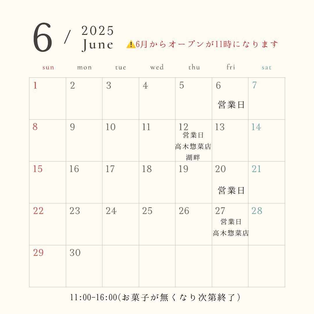 6月の営業から営業開始時間を11:00に変更します。 ご承知のほどよろしくお願いします(※5月30日(金)は10:30開店となります)。